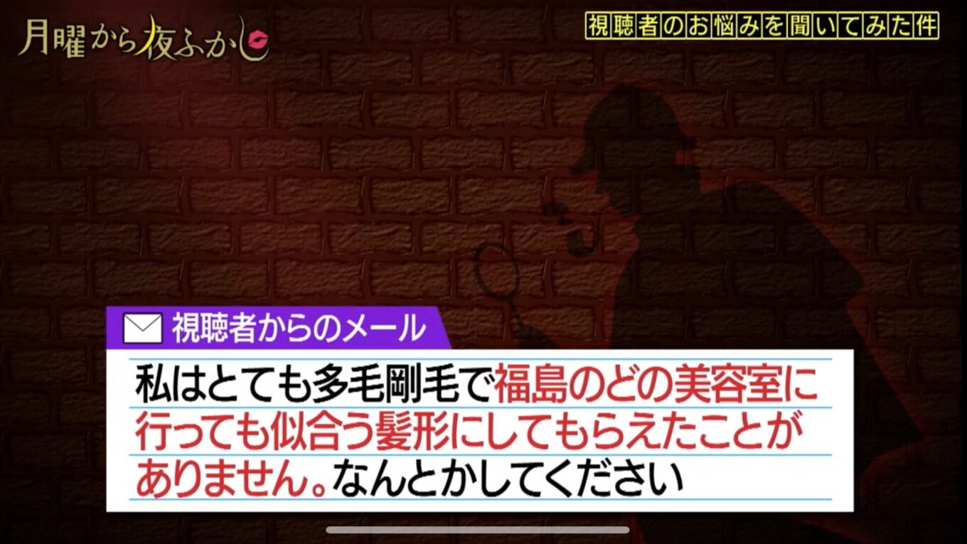 9/22 月曜から夜ふかし 「私はとても多毛剛毛で福島のどの美容室に行っても似合う髪型にしてもれたことがありません。なんとかしてください。」