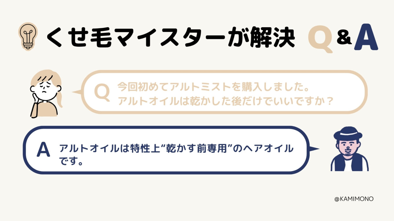 【美容師が解説】アルトオイルは乾かした後に使うと効果なし?正しい使い方とタイミング 2025.10.25 Q&A のっち KAMIMONO BLOG 9/22 月曜から夜ふかし 「私はとても多毛剛毛で福島のどの美容室に行っても似合う髪型にしてもれたことがありません。なんとかしてください。」 2025.09.26 ヒト のっち KAMIMONO BLOG 縮毛矯正後の髪がパサつく原因と解決法|アルトオイルとゴールデンオイルの使い分け完全ガイド 2025.09.14 Q&A のっち KAMIMONO BLOG 01ゴールデンオイルの3つの使い方 2025.09.08 くせ毛を活かす のっち KAMIMONO BLOG アイロン前にミストやオイルはNG!くせ毛専門美容師が教える正しいヘアケア方法 2025.09.05 Q&A のっち KAMIMONO BLOG 【美容師監修】あなたのくせ毛タイプは?4つの種類と見分け方完全ガイド|正しいケア方法も解説 2025.08.15 くせ毛の基礎知識 のっち KAMIMONO BLOG 髪質改善トリートメントの新定番!リリミミヘアミストで補修力の高い素髪ケアを 2025.08.09 カミモノ紹介 しゅしゅ KAMIMONO BLOG 01ゴールデンオイルは出る量が多い?実はコントロールが簡単に出来ます! 2025.03.03 Q&A のっち KAMIMONO BLOG 【2025永久保存版】縮毛矯正とは?メリット・デメリットを徹底解説 2025.02.17 縮毛矯正・髪質改善 のっち KAMIMONO BLOG 「合わなかった、乾かない。」01ゴールデンオイルの悪い口コミ 2025.02.13 Q&A のっち KAMIMONO BLOG もっと見る
